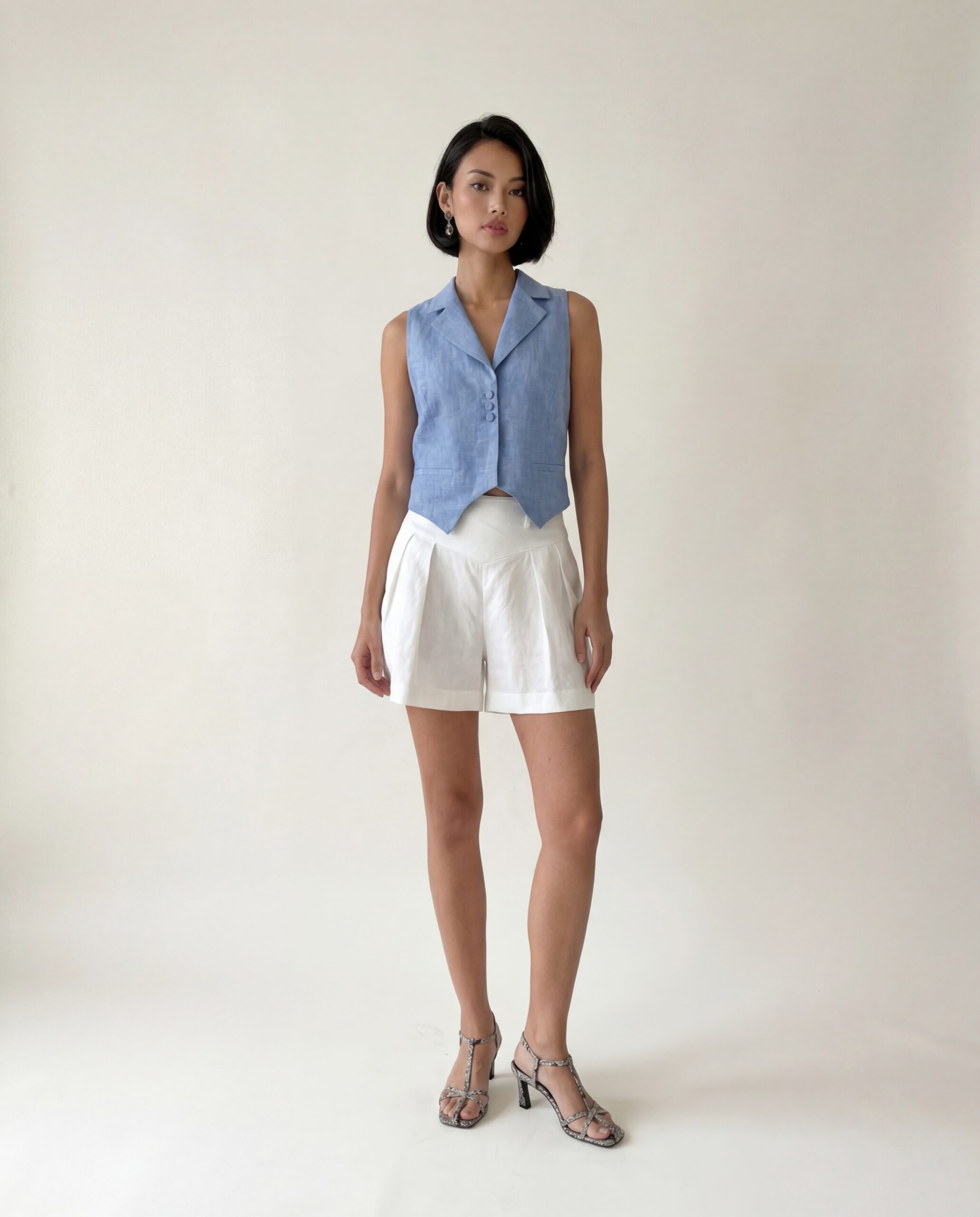 Shella Vest is a modern interpretation of the classic waistcoat, defined by clean lines and a softly structured silhouette. Designed to move effortlessly with the body, it embodies ease, balance, and refined simplicity.